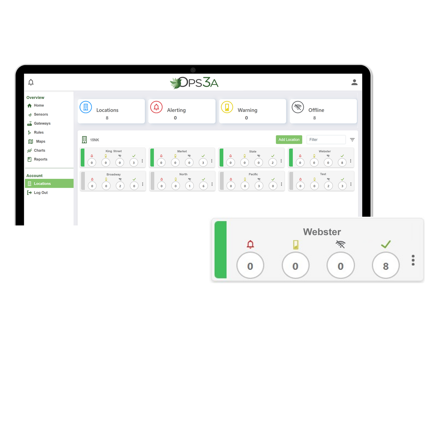 The Ops3A Platform lets you monitor and control multiple locations all at once. You can manage every system remotely, customize individual settings, check battery levels and more.